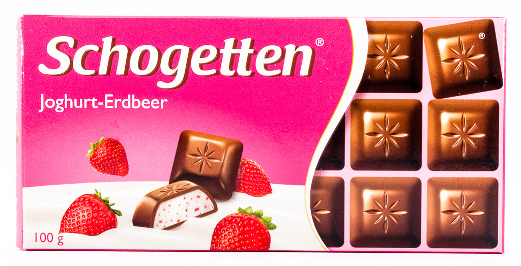 Schogetten is a product of the German candy manufacturer Ludwig Schokolade, one of Europe's most successful confectionary suppliers. The founder Leonhard Monheim invented his first chocolate under the name Trumpf in 1857. Trumpf chocolate is known very good in Germany until today. 1962 the Schogetten were introduced. Today there are many of different sorts, but we selected the yoghurt strawberry one. What I like the most about Schogetten is that it is not a chocolate bar as we know it from other brands, the package is filled with small bite-sized chunks. Every chunk is filled with a yoghurt cream added by little strawberry pieces. The milk chocolate coating is very creamy and the perfect coating for the inner cream. There is not much more to say about Schogetten. Try it and love it!