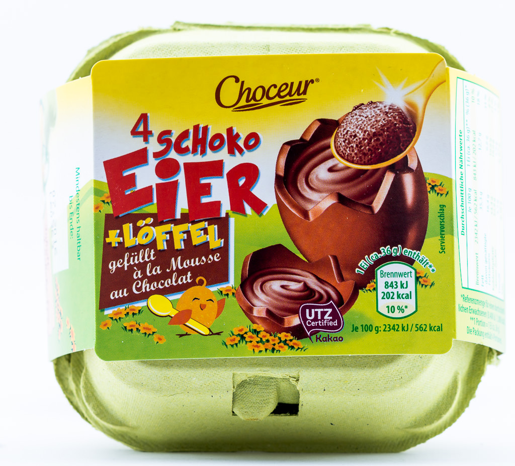 Last Easter we sent you this egg box in your Candy German subscription box, too. Back than, it contained four eggs filled with milk cream. You told us that you loved it – the packaging and the treat. So we thought: Why don’t include the eggs in this year’s Easter box again? But this time we selected another sorts. The package includes 4 individually wrapped chocolate eggs, that are filled with Mousse au Chocolat, and two plastic spoons. The mousse is so soft and fluffy that you can spoon it very easily. But first you have to crack the lid of the eggs along the jagged perforation. You can do this with one of the spoons. Then you reach the heavenly mousse. Thumps up for the German company Brandt that is the producer of those eggs. The Choceur Schoko Eier are really a fun treat for kids as well as for grown ups and they are mouth-watering – the perfect treat for Easter!
