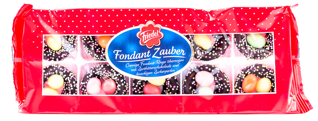 Creamy fondant rings covered in dark chocolate and decorated with crunchy and colorful sugar pearls – sounds good, doesn’t it? The second Friedel product in your Candy German subscription box is not only tasty, it also looks very beautiful. The little goodies are supposed to resemble little bird nests containing eggs. There are 10 pieces in your package.
