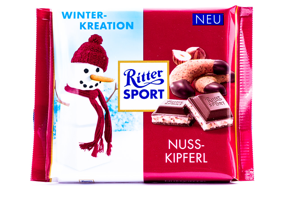 We were delighted to see that Ritter Sport offers this special Christmas edition of their traditional brand. Nusskipferl is quite difficult to translate, because "Kipferl" is a south German dialectical word for an object that is crescent-shaped. On the Ritter Sport wrapping you can see those little crescent-shaped cookies: Those are Nusskipferl = crescent-shaped nut cookies. And that’s exactly what Ritter Sport put in its Christmas edition. The always phenomenal Ritter sport milk chocolate is filled with a cream that exactly tastes like Nusskipferl. There are small cookie pieces and hazelnuts in the cream and so Ritter Sport Nusskipferl tastes creamy and nutty at the same time. I’m sure you will love it!