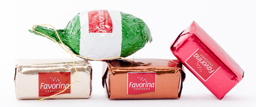 Those little goodies are all different and so good. The first is a nougat fir cone. Hazelnut nougat is covered in rich milk chocolate. The second, the one in the red wrapping, is marzipan covered in dark chocolate. The third, the one in the brown wrapping, is Mocha marzipan with a light coffee flavor, and the fourth, the one in the golden wrapping, is precious hazelnut nougat without any coating. What is special about the two marzipan goodies is that they come from the city of Lübeck in north Germany. Lübecker Marzipan again is a protected designation of origin.