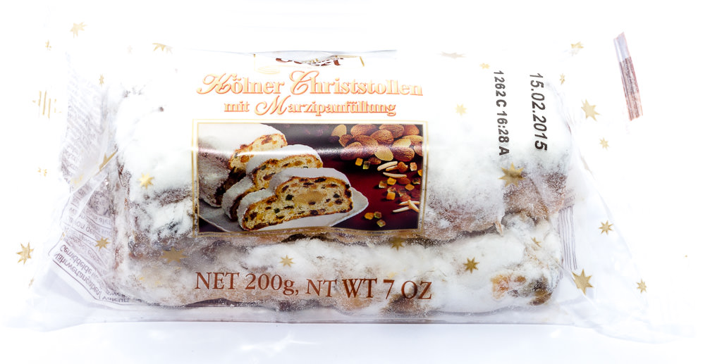 Definitely one of the most eaten German holiday treats is this fruit cake. As we live in Cologne, we wanted to support a family business located in Cologne, which is Konditorei Oebel, and put their Christstollen – or simply called Stollen – in your Candy German subscription box. Certainly, another reason is that it's very high in quality and very tasteful. Konditorei Oebel is known for being one of the best bakeries in Cologne. We often buy pastry products there and are always pleased.