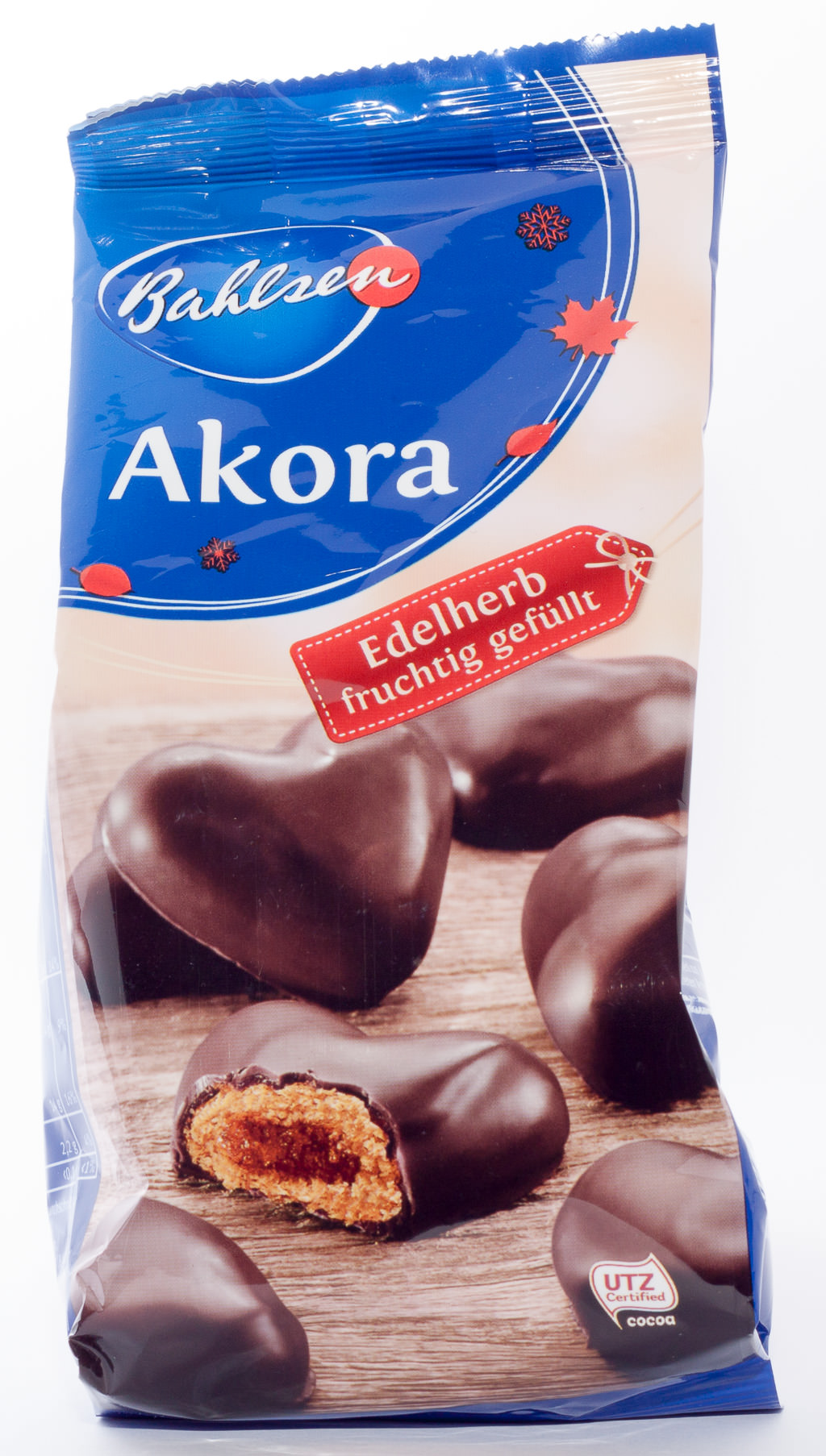 We are very sorry, we could not send a real Oktoberfest heart, it would have been broken during shipping. Therefore we selected the Bahlsen Akora gingerbread hearts for your monthly candy subscription box. The best thing about them is that they taste phenomenal – much better than the real Oktoberfest hearts which are more for decoration than for eating, and so they are often dry and tasteless. Bahlsen, the market leader for cookies and pastry in Europe, exists since 1889 and is known for its high quality products. The Akora hearts are filled with delicious jam which fuses with the gingerbread base. The heart-shaped gingerbread is surrounded by dark chocolate. When you open the bag you immediately smell the delicious flavor which is mouth-watering. The hearts are very juicy and mellow – enjoy!