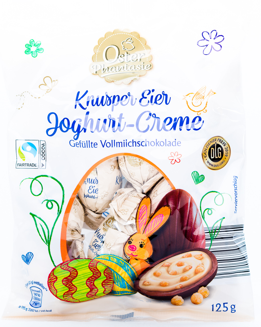 These are filled chocolate Easter eggs too, but they are very different from the truffles. Either you get yoghurt cream eggs or almond cream eggs. Both sorts have small crisps in the filling. I love both sorts, they are delicious.