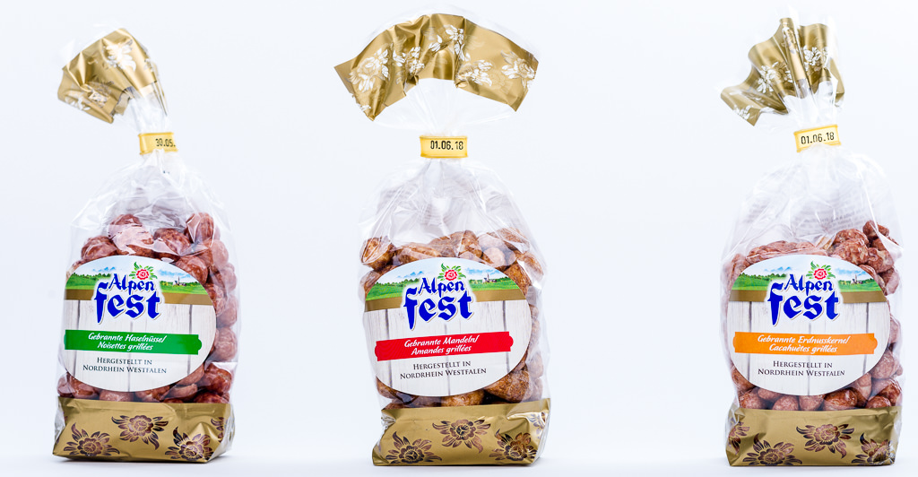Either you got the Alpen Fest roasted hazelnuts, the roasted almonds, or the roasted peanuts. All three of them are glazed with sugar. Nuts in a sweet coat – nothing can be wrong about that. Enjoy your crunchy and sweet German snack.