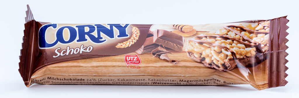 There are two Corny bars in your monthly candy subscription box from Germany: the chocolate bar and the chocolate banana bar. I love both. The milk chocolate ground is added by a crunchy and thick cereal layer which is kind of sticky and stretchy. Both bars contain honey and have a chocolaty taste. The chocolate banana bar additionally has a nice banana flavor.