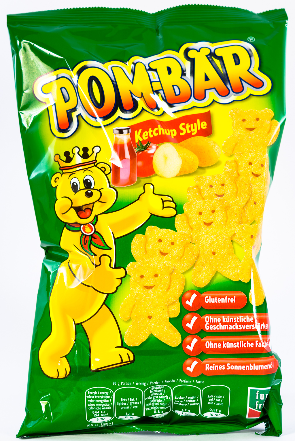 Last summer you received the Pom-Bears in your German candy subscription box too – the original flavored and the ketchup style bears. You told us that you loved them, especially the ketchup style sort, so here it is again. Pom-Bär is a very well known product by the German company Intersnack. I remember Pom-Bär being a new product when I was a kid – it was really a must-have. Back then only the original sort was available, later other sorts completed the assortment. All sorts have in common that they are gluten free, without artificial flavor enhancers or artificial coloring, and they contain pure sunflower oil. The Pom-Bears Ketchup Style are very crunchy and tasty and have an intense ketchup flavor. They are pleasantly salty and not as greasy as normal potato chips are. Enjoy your Pom-Bears!