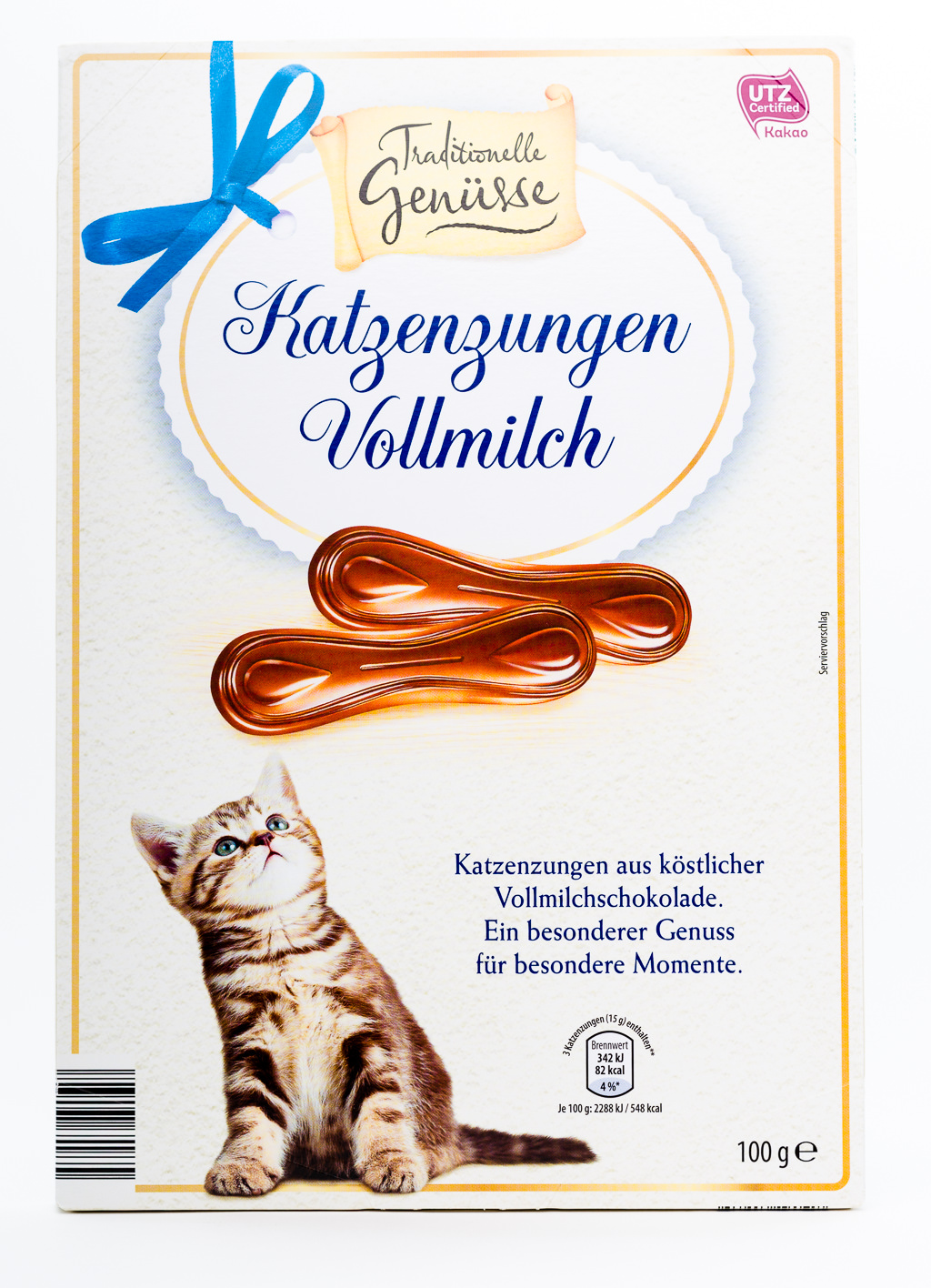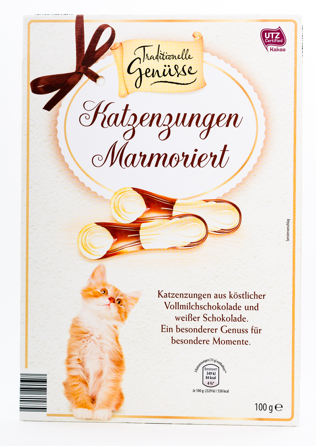 Recently we found this very traditional German treat. Katzenzungen = cat tongues are eaten in Germany as well as other European, Asian and South American countries since the 19th century. The small chocolate bars are very thin and resemble the tongue of a cat. Either you got the milk chocolate cat tongues or the milk and white chocolate cat tongues. Both are very creamy and so delicious. The producer of this treat is the traditional German chocolate company Waldbaur which exists since 1848.