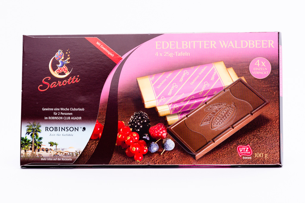The brand Sarotti is known as "die Kakao Schokolade" = the cocoa chocolate. It was invented in 1852 by the German candy company Stollwerck that is located in our hometown Cologne. A brand that convinces chocolate lovers for such a long time must find its way into your monthly candy subscription box from time to time. We sent Sarotti truffles before, but this time we decided for a chocolate bar. Actually there are four small individually wrapped chocolate bars in your package. The fine dark chocolate consists of 60% cocoa. The bars are quite thin and therefore very crunchy. They are added by small pieces of forest berries what gives the chocolate an interesting note. It tastes kind of light, fruity, sour, and sweet at the same time. Did you notice the phenomenal odor of your Sarotti bar? You can even smell it through the package – yummy!