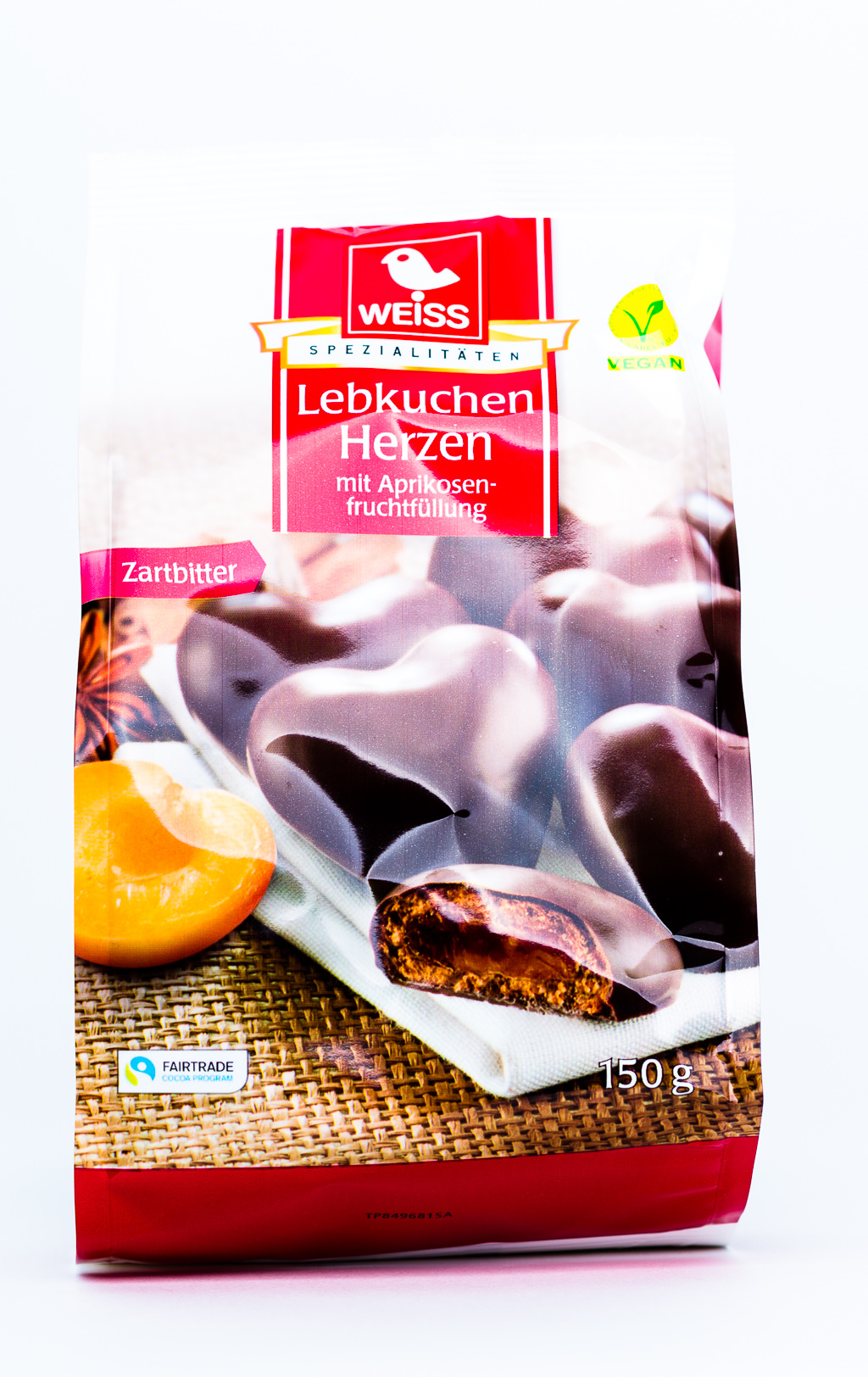 If you like German Lebkuchen (gingerbread), I’m sure that you like these gingerbread hearts. The gingerbread is very soft and spicy. There is a sweet and fruity apricot filling in the centre of each heart. The dark chocolate icing is a perfect fit to the gingerbread. Weiss is a brand by Lambertz. It stands for quality and indulgence – the proof are their gingerbread hearts which by the way are suitable for vegans.